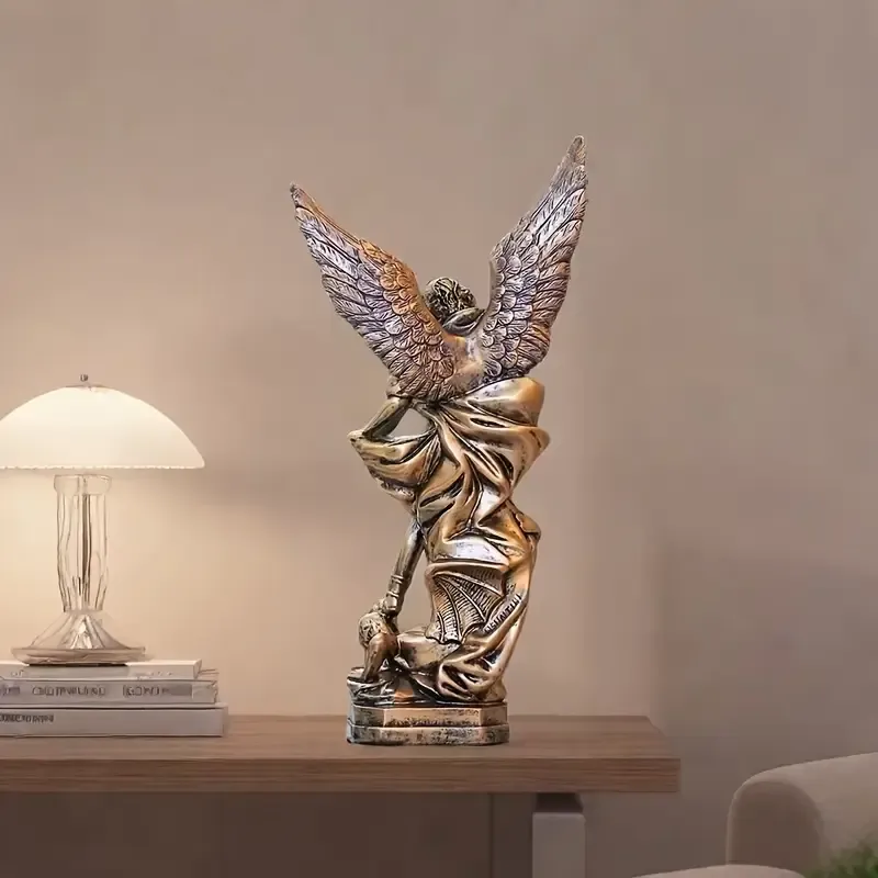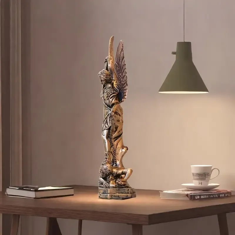 This statue of Archangel Michael, crafted with exquisite craftsmanship, embodies a classic religious image. With wings spread and a majestic figure, Archangel Michael appears victorious over demons, symbolizing justice, courage, and protection. Its vintage metal texture blends religious meaning with artistic beauty, making it a perfect decorative piece for homes and offices, adding a unique atmosphere and expressing a sense of faith. Whether you're a fan of religious art or someone seeking a unique decorative object, this statue will captivate you.